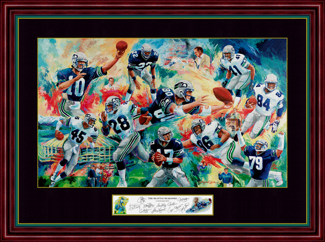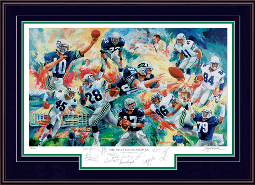 | THE SEATTLE SEAHAWKS A Retrospective (Lithograph) by Sanford Holien A stirring and historic tribute to the legendary players who have worn the Seattle Seahawks uniform during the Kingdome era. Every player honored on the Seahawks Ring of Honor at Qwest Field has personally autographed this Lithograph. Limited to 300 lithographs plus 50 artist proofs and 150 player proofs. Each full-color print features original pencil-signed autographs from each player and are artist signed and numbered with a personalized Certificate of Authenticity. |