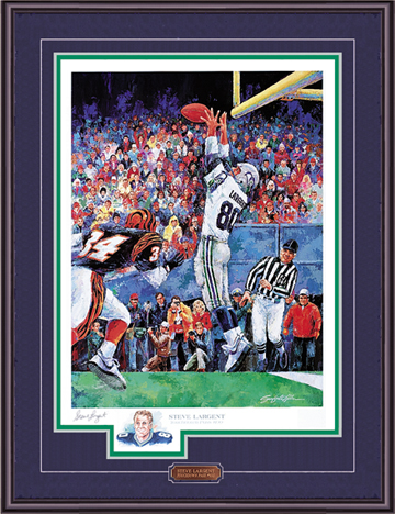 STEVE LARGENT Touchdown Pass #100 by Sanford Holien Dramatically depicting the actual moment that Largent stretches high under the end zone goal post, barely keeping his feet in bounds, to complete his record breaking 100th touchdown pass. Limited to 750 lithographs plus 100 remarqued artist proofs. Each print features an original pencil-signed autograph from Steve Largent. Artist signed and numbered with a personalized Certificate of Authenticity. |