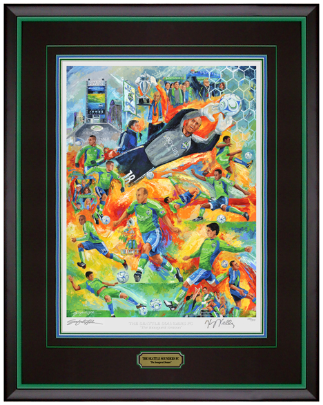 The legendary Kasey Keller is joined on the pitch and in the painting by Freddie Ljungberg, Fredy Montero, Osvaldo Alonso, Brad Evans, Jhon Kennedy Hurtado, Nate Jaqua, Patrick Ianni, Tyrone Marshall, James Riley and Steve Zakuani. The U.S. Cup Championship and other iconic moments, images and personalities are also depicted in this one of a kind work of art. World class, international athletes competing in the non-stop action of MLS Soccer!. Lithograph size: 22" x 30" |